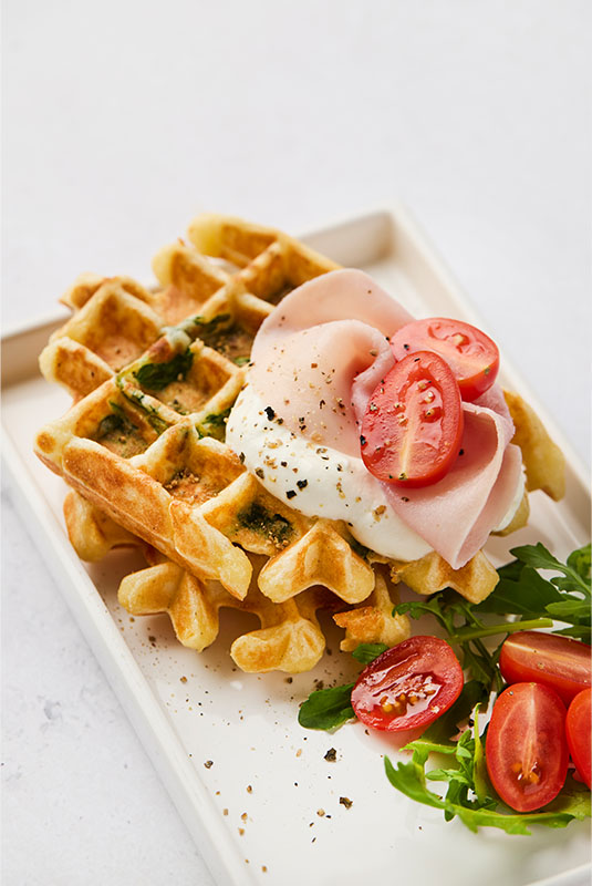 Gaufres salées au fromage avec yaourt Greek style, jambon cuit et tomates cerises