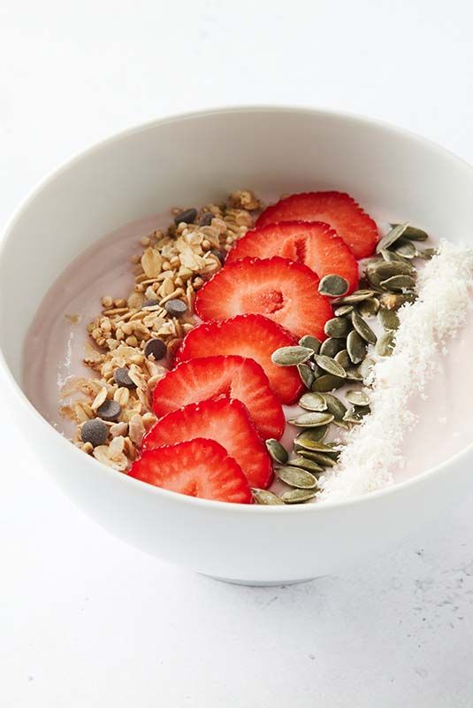 Serveer yoghurt in een mooie ontbijtkom.Voeg fijne sneetjes aardbeien, pompoenpitten, granola en kokosrasp toe.