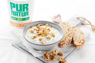 Was de komkommer en rasp deze grof. Voeg hierbij de yoghurt en geperste knoflook. Snipper de dille en hak de noten. Voeg toe en kruid af met peper en zout.