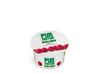 Organic full-fat stirred yoghurt with mixed-in raspberries in a compact 100g single-serving pot.
