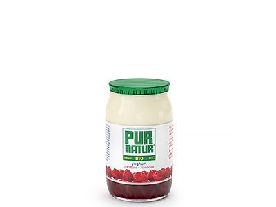 Organic full-fat stirred yoghurt on a bed of raspberries in a 150g glass pot.