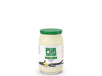 Organic full-fat stirred yoghurt with vanilla in a 150g glass pot.