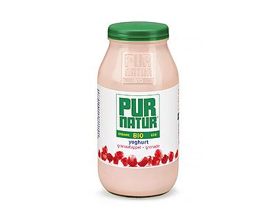 Organic full-fat stirred yoghurt with pomegranate juice in a resealable 500g glass pot.
