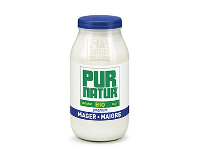 Organic low-fat stirred yoghurt in a resealable 500g glass pot.