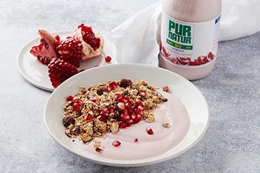 Toasted oat flakes and hazelnuts with pomegranate fruit yoghurt