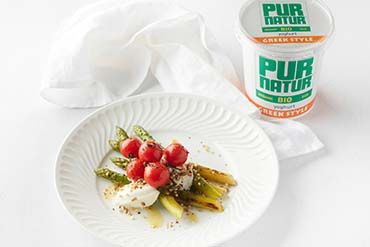 Green asparagus, cherry tomatoes, Greek style yoghurt and seeds