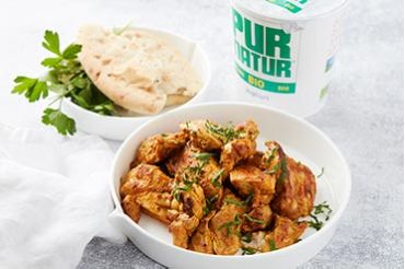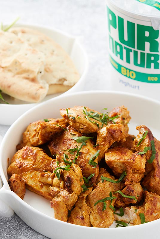 Mix the yoghurt with the tikka masala paste. Cut the chicken thigh meat into pieces and season with salt and pepper. Mix the chicken with the marinade and refrigerate for 3 hours. Toss now and then. Fry the chicken in oil over medium heat. Serve the chicken with some extra yoghurt and naan breads.