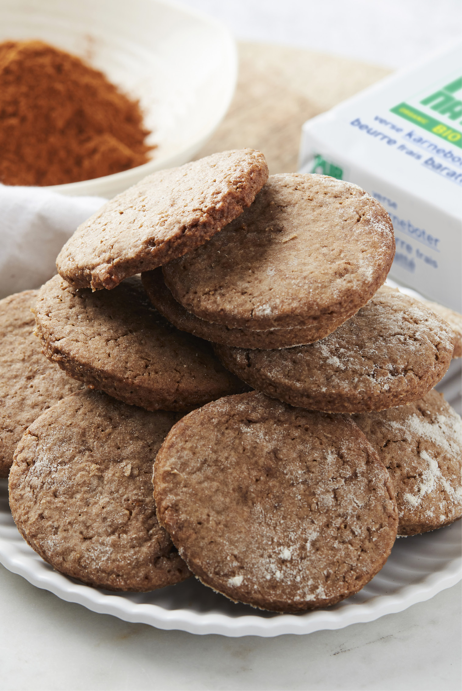 Mix all the ingredients in your kitchen machine until you obtain a stiff dough. Wrap in cling film and refrigerate for a few hours. Pre-heat the oven to 180°C. Roll out the dough on a floured surface to a thickness of about 4 mm. Cut out biscuits and bake on a tray lined with parchment paper in the oven for 12 min.