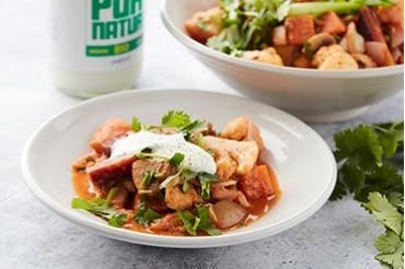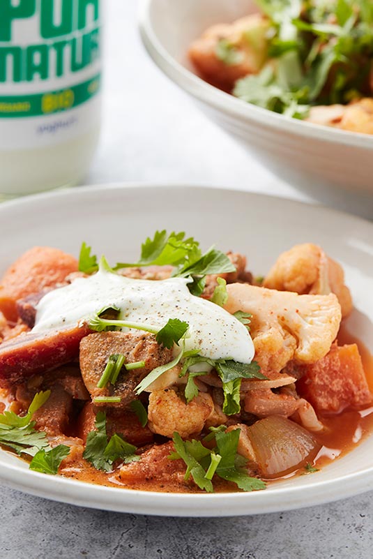 Blanch the lentils for a few minutes in salted water and drain. Wash the vegetables and chop them into pieces. Cook in some oil, then add in the curry paste. Cook briefly, then add the yoghurt and the stock. Cover and cook until done over low heat. Add the lentils at the end. Check the seasoning when done and serve. Garnish with some yoghurt and coriander if you like.