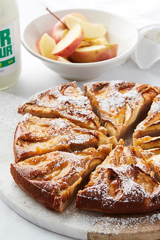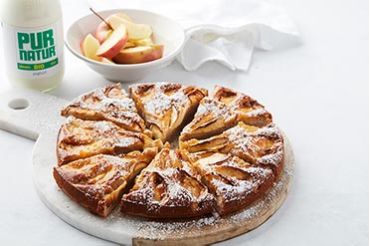 Mix the flour with the baking powder, the almond flour and a pinch of salt. Beat the eggs with the sugar to obtain a light, airy texture. Add the oil and the yoghurt. Fold in the flour mixture. Pour the batter into a floured cake pan. Line with apple slices. Bake the cake for 45 min. in a pre-heated oven (180°C). Remove the cake from the oven and set aside to cool. Brush the cake with the jam.