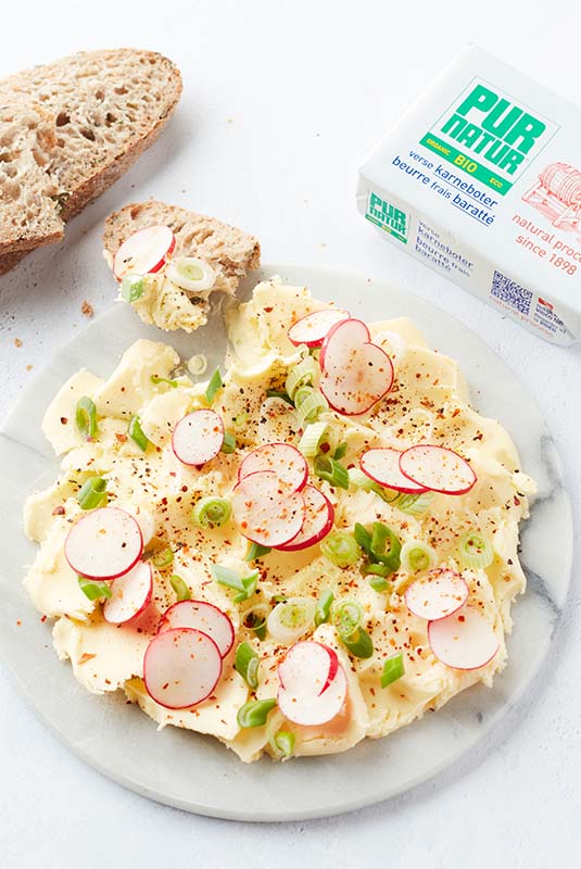 Cut fine slices of butter, let briefly come to room temperature and arrange nicely on a plate. Wash the radishes and cut into thin slices. Cut the green of the spring onions into very fine strips. Place the spring onions and radishes on the butter and finish with salt and pepper.