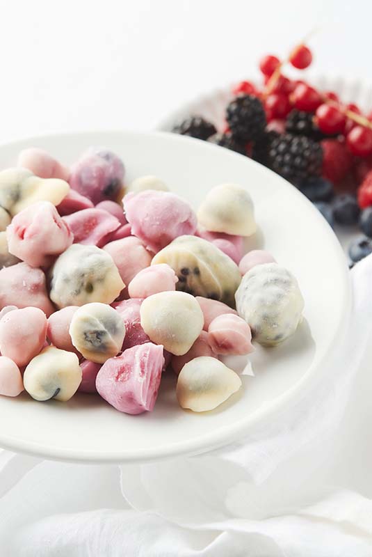 Spoon the fruit yoghurt around the berries and transfer to a flat freezer-proof container with a lid. Freeze for two hours.Remove from the freezer and separate the berries. Transfer to bowls. Delicious as an afternoon snack!