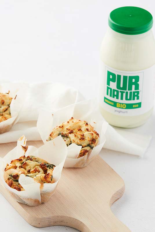 Preheat the oven to 180°C. Sauté the spinach until wilted and set aside to drain in a sieve. Mix the yoghurt with the flour. Add the eggs and beat into a smooth batter. Squeeze the moisture from the spinach and mix into the batter. Make muffin liners from baking paper or use ready-made muffin liners to line a muffin tin. Ladle the batter into each liner, filling it up to the edge. Top each muffin with flakes of feta cheese. Bake the muffins for 20 minutes until brown. Prick in the muffins with a skewer to see if they are cooked. The skewer should come out dry.