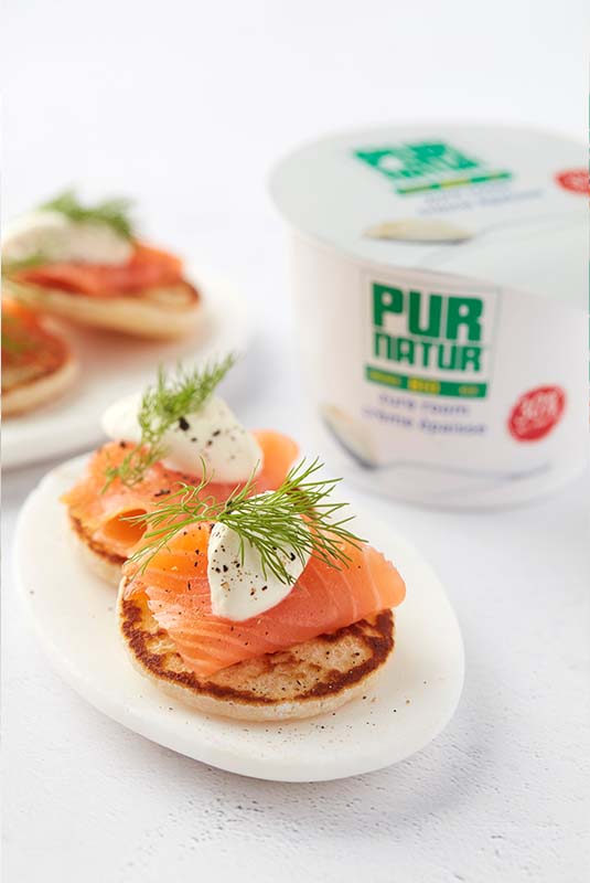 Slice the salmon into 12 equal parts.Top the blinis with the pieces of salmon.Finish with a dollop of sour cream, a sprig of dill and little freshly ground salt and pepper.