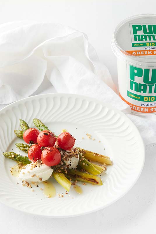Green asparagus, cherry tomatoes, Greek style yoghurt and seeds