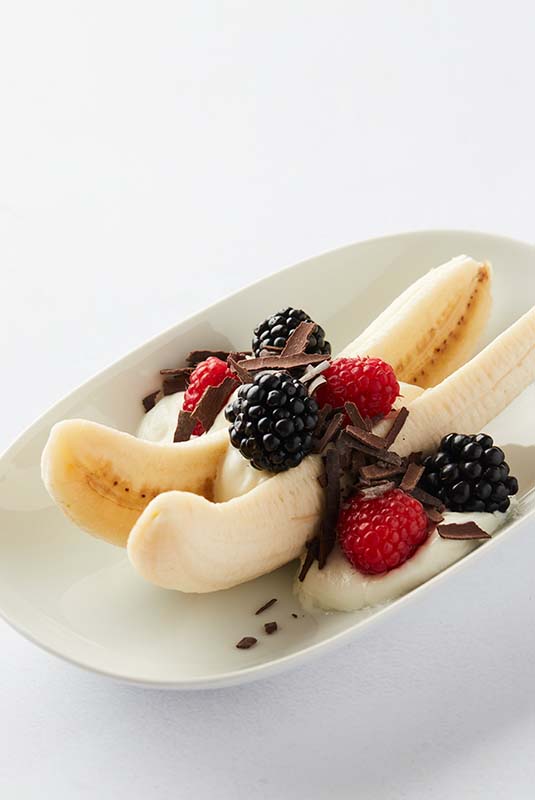 Slice the banana in half lengthwise. Spoon the yoghurt over the banana halves, top with the fresh fruit and garnish with the chocolate flakes.