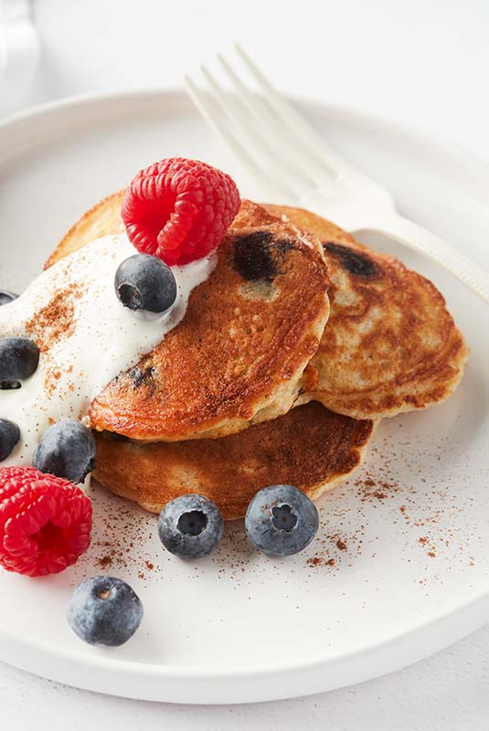 In a small bowl, mix the egg, yoghurt, oat bran, cinnamon and baking powder. Set aside for 5 minutes. Add a handful of berries to the batter. Heat the coconut oil in a frying pan. Bake small pancakes, using a tablespoon of batter for each pancake. Cook until bubbles form and the pancake has firmed up slightly, then flip to cook the other side. Make a stack of pancakes and finish with more yoghurt, blueberries, raspberries and a sprinkling of cinnamon.