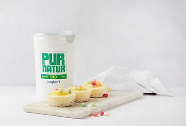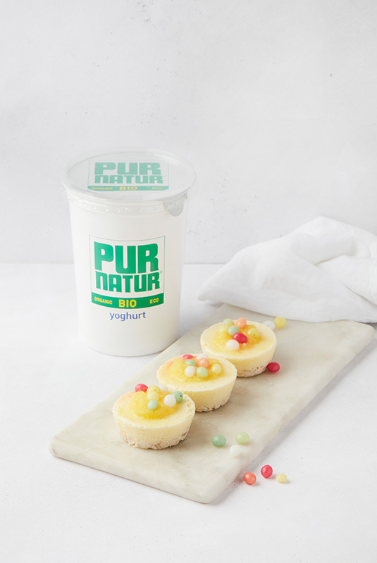 Mix the oatmeal with 6 tbsp of yoghurt and press into the bottoms of six muffin cavities. Freeze for one hour. Cut the mango flesh into chunks, add the sugar and purée in a blender. Mix half the puréed mango with an equal amount of yoghurt. Fill the muffin cavities with the mango-yoghurt mixture. Freeze for at least another two hours. Retrieve the frozen yoghurt treats from the freezer and pop out of the tray. Spoon a dollop of mango purée on top and garnish with sugar eggs.