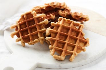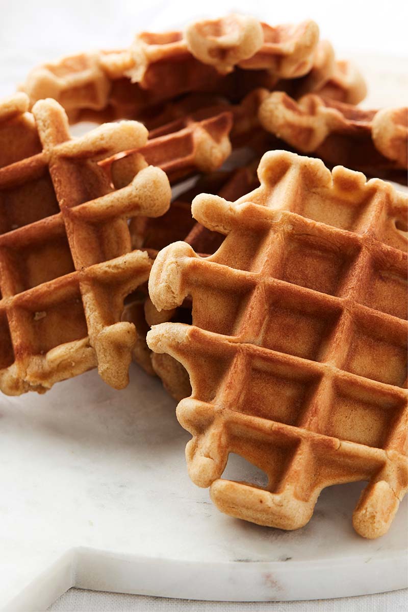 Combine all the dry ingredients and mix in a kitchen machine with the dough hook. Add the eggs one by one. Melt the butter and pour it in the mixture in a thin stream. Mix until smooth. Cover with cling film and refrigerate until stiff. Heat the waffle iron and spoon the batter onto your waffle iron using a scoop. Bake until golden brown.