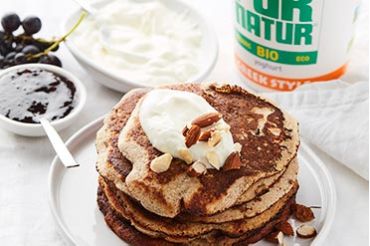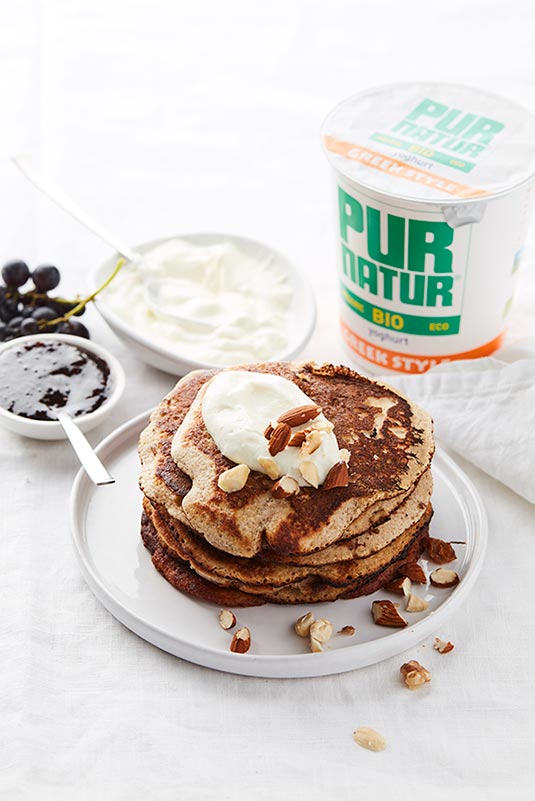 Beat the egg whites with sugar until stiff. Mix the yolks with all the other ingredients and the melted butter and beat until completely smooth. Fold in the egg whites. Cook the pancakes over high heat. Put some butter (and oil) in the pan for each pancake.