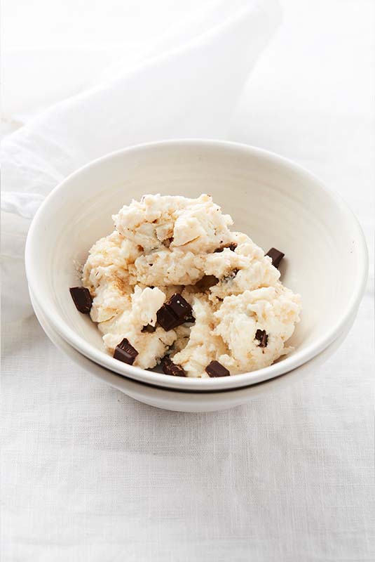 Mix the ingredients and freeze. Stir frequently until the mixture has stiffened. Serve.