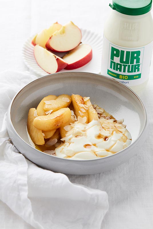 Peel the apple and cut into wedges. Cook the apple over medium heat with some butter. Sprinkle over some sugar and let it caramelise. Serve with the yoghurt and some agave syrup.