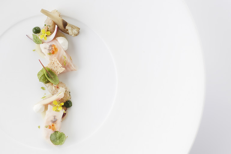 Marinated trout & tartare, capucine tubers, Greek yoghurt with lime, Chervil coulis, cucumber sorbet with sour cream on a bed of crumble