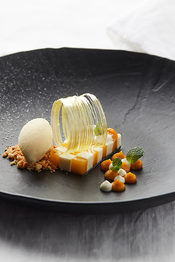 Lay out mosaic on a plate, add dots of yoghurt jelly and mango jelly and balance a sugar spiral on top. Arrange crumble to one side and top with the bergamot sorbet.