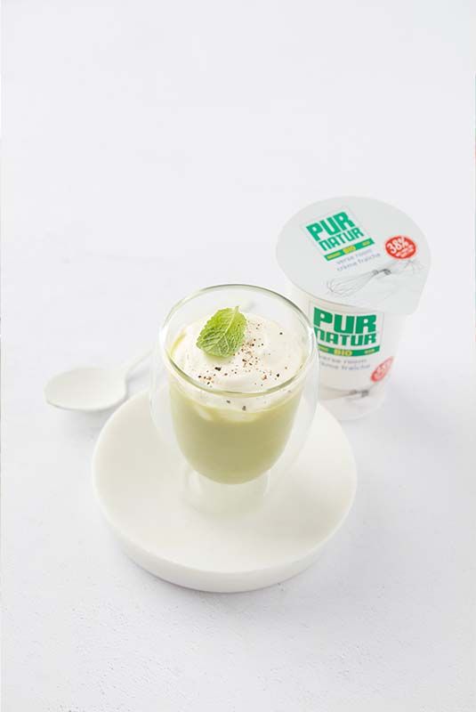 Fruit de gesnipperde ui aan in wat Pur Natur verse trommelkarneboter. Voeg de erwtjes toe. Voeg water toe tot alle erwtjes bedekt zijn. Voeg het bouillonblokje toe en breng aan de kook. Zet het vuur zachter en laat nog 15 minuten verder garen. Snijd ondertussen de avocado in blokjes. Voeg toe aan de soep, laat nog 2 minuten mee opwarmen. Mix de soep en breng op smaak met peper en zout.