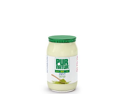 Iogurte orgânico com matcha e pêssego em pote de vidro de 150g.